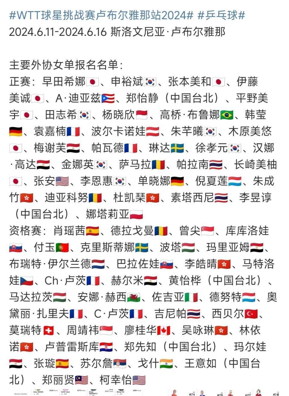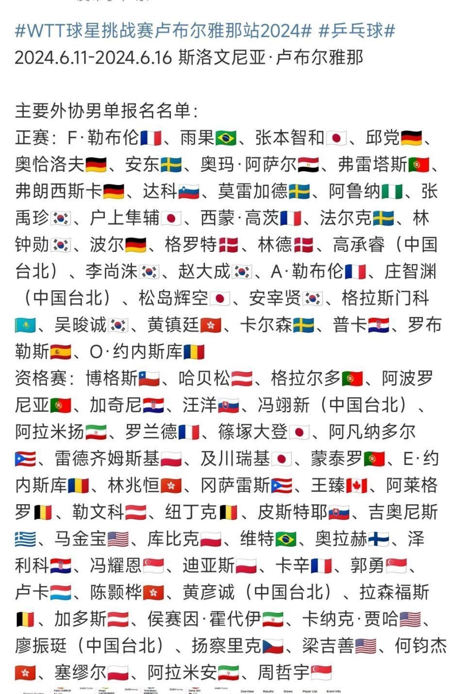 WTT球星挑战赛卢布尔雅那战比赛本事为2024年6月11-16日在斯洛文尼亚·卢布尔雅那举行!国乒不投入,日乒全主力投入,勤苦以赛代练!日乒张本智和、户上隼辅、松岛辉空、篠塚大登、及川瑞基等东说念主投入,不外,日乒男队的实力正在阑珊,张本智和无法回四川检会,失去了占用国乒检会资源的契机之后,就一冠难求,泯然世东说念主矣。因此,这届球星赛咱们看好F勒布伦夺得冠军!